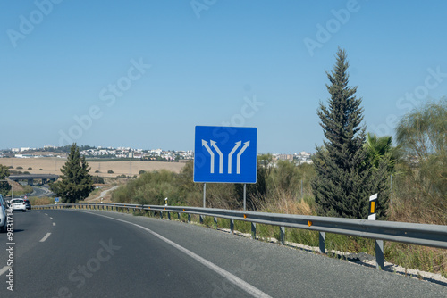 Driving car or family camper in summer, road signs and directions, no traffic jam on touristic road in Andalusia, Spain