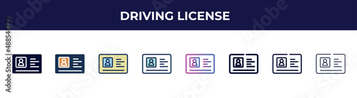 driving license icon in 8 styles. line, filled, glyph, thin outline, colorful, stroke and gradient styles, driving license vector sign. symbol, logo illustration. different style icons set.