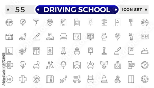 Driving School Outline Icon Set – Cars, Traffic, Education, and Transportation.
