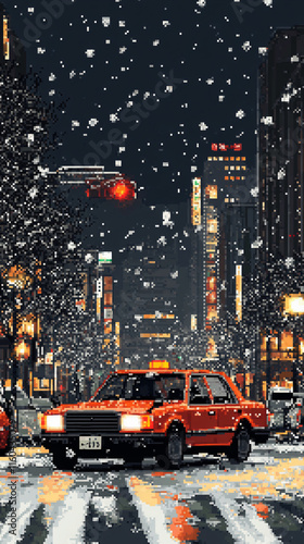 Driving snowy Tokyo street night depicted pixel art 8-bit style glowing skyscraper festive light atmospheric urban ambiance creative nostalgic storytelling wallpaper clipart