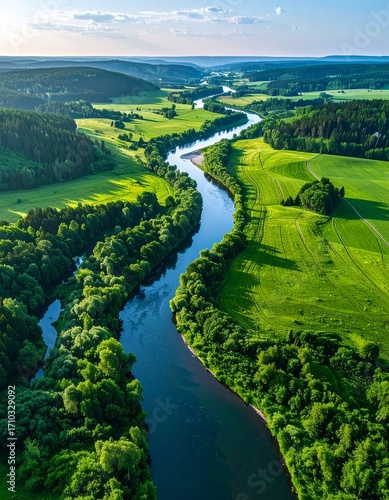 Drohnenaufnahme einer grünen Landschaft mit Fluss, Feldern und Wäldern, Vogelperspektive.