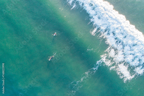 drone aerial overhead view of surfers practicing surfing on a beach in summertime