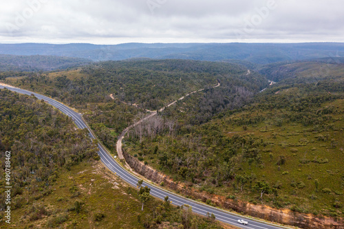 Drone aerial photograph of a highway running through a forest in regional Australia.