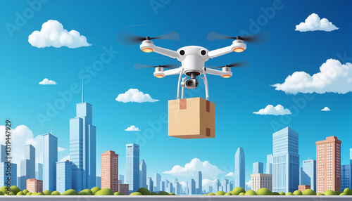 Drone delivering package over futuristic smart city, innovation concept