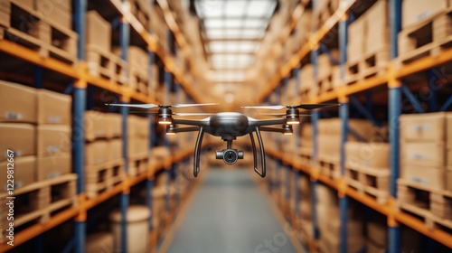 Drone delivery in warehouse operations logistics center technology showcase industrial environment aerial perspective