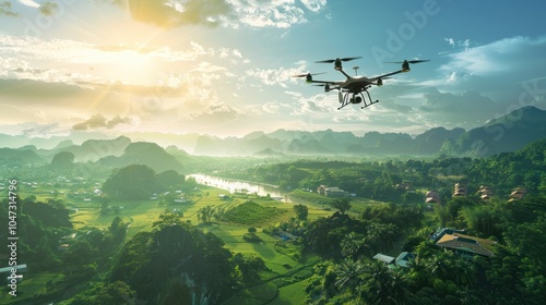 Drone Flying Over Lush Green Valley with Mountains in the Background
