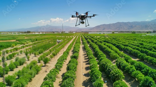 Drone Flying Over Rows of Crops in a Field with Mountains in the Background