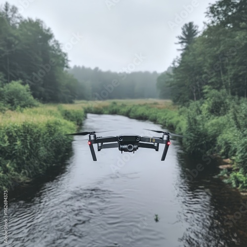 Drone Flying Over Scenic River Landscape in Lush Green Forest