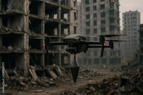 Drone hovering above ruined buildings, capturing destruction in an urban wasteland.