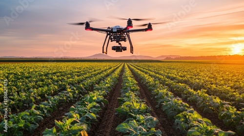 Drone hovers over vast agricultural fields bathed in warm morning light, capturing the beauty of sustainable farming.