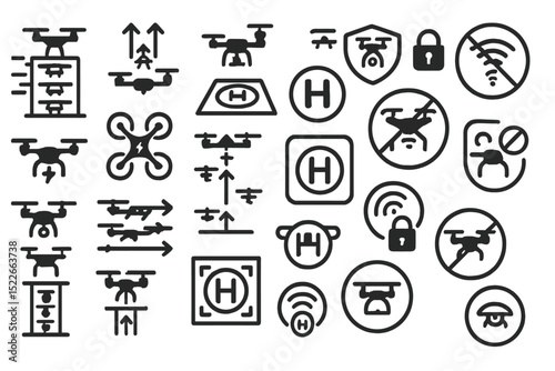 Drone operation and no-fly zone icon set with takeoff, landing, and security