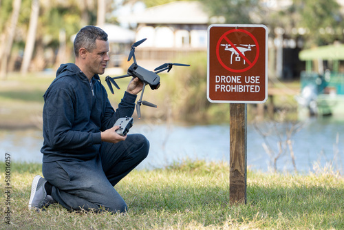 Drone operator is disappointed because he isn't allowed to fly his quadcopter in national park no drone area. Man is unable to use his UAV near restriction notice sign. Airspace use regulations