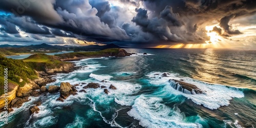 Drone Photography Capturing an Angry Expression in a Dramatic Landscape with Stormy Skies and Turbulent Waters Below, Showcasing Nature's Fury from Above