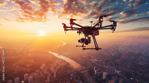 drone quad copters with high resolution digital camera flying aerial over spectacular sunset orange sky