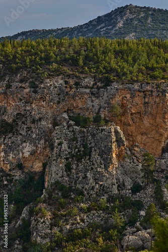 Drone scenic view of canyon covered with greenery on a sunny day in the suburbs of Marmaris, Turkey