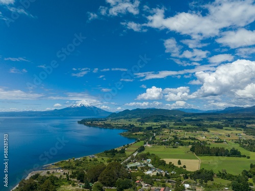 Drone shot of the Osorno Volcano under the blue cloudy sky in Chile with Llanquihue lake on its foot