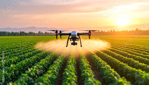 Drone Spraying Crops at Sunset: A drone efficiently sprays crops in a vast field during a vibrant sunset, showcasing advanced agricultural technology.