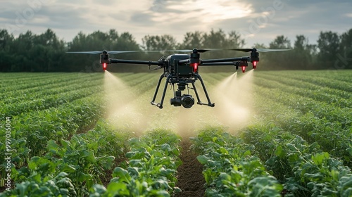 Drone spraying fertilizer on vegetable green plants, Drone flying and spraying fertilizer on the agriculture fields, Agriculture technology.