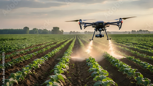 Drone spraying fertilizer on vegetables of a agriculture farm