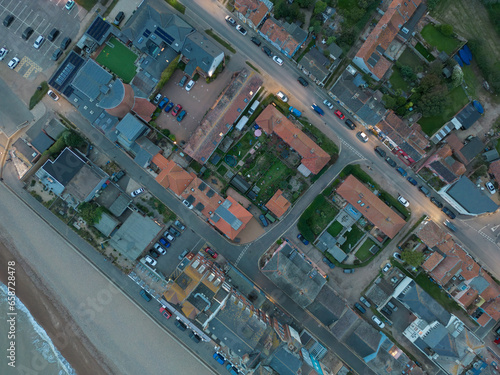 Drone top down view of a dusk image of a British seaside town. Showing part of the deserted beach and lit street lights.