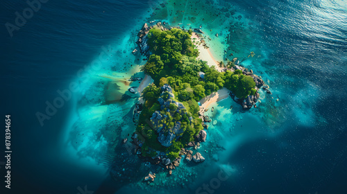 Drone view of a picturesque island with white sandy beaches, turquoise waters, and a coral reef surrounding it, making it a perfect paradise for nature lovers and vacationers