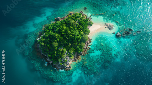 Drone view of a picturesque island with white sandy beaches, turquoise waters, and a coral reef surrounding it, making it a perfect paradise for nature lovers and vacationers