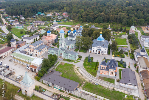 Drone view of Optina Pustyn monastery on cloudy summer day. Kaluga Oblast, Russia.