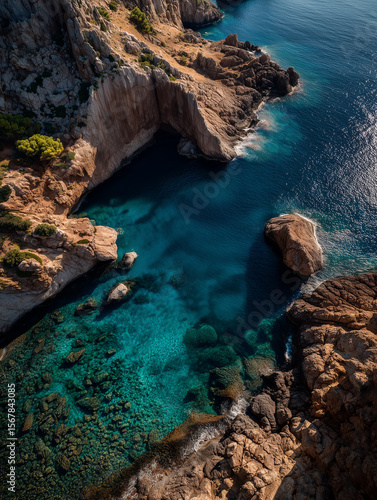 Drone view of rocky coastline revealing hidden turquoise waters and unique rock formations in a serene landscape