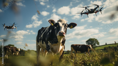 Drones fly near herd of cows on sunny day photo realistic image. Monitoring and managing livestock photography wallpaper. Farming UAVs picture scene. Animal welfare concept photorealistic