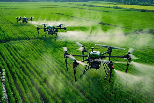 Drones Flying Over Lush Green Farmland Spraying Pesticides