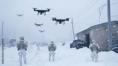 Drones in formation soar above a snow-covered military outpost, silhouetted against the white expanse, as soldiers in white camo prepare defenses.