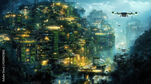 Drones surveying a futuristic eco-city at night urban landscape digital art high-tech environment aerial view