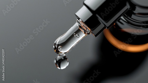 Dropper bottle of serum with clear liquid dropping mid-air, white background only, elegant and minimal aesthetic, close-up view with natural studio shadows