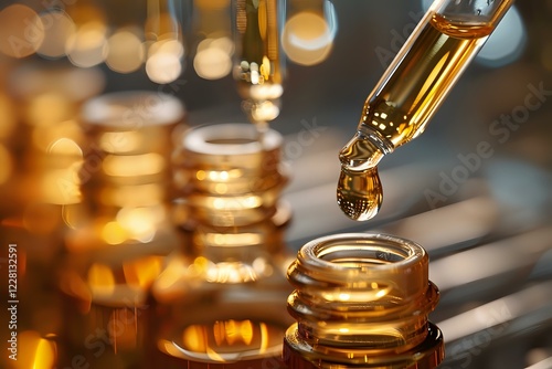 Dropper with golden oil or serum dripping into glass bottle, luxury skincare concept with warm bokeh background, perfect for beauty and cosmetic advertising.
