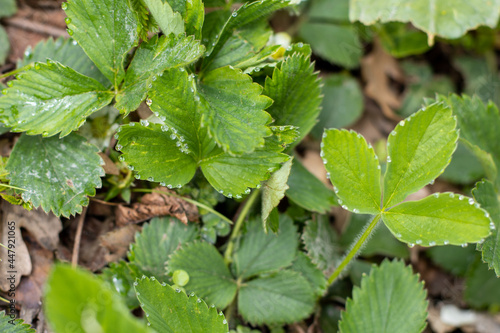 Drops of morning dew on strawberry leaves.