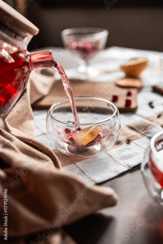 drops of red tea, woman pouring tea into a glass cup, hibiscus, tea with red berries, vitamin drink, winter tea for colds, lemon, red currant, black currant, raspberry, honey, cinnamon, anise