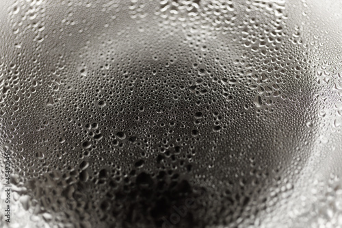Drops on glass. Texture for designer background. Drops of water flow down the surface of the clear glass on a black background. Raindrops for overlaying on window. Concept of autumn weather.