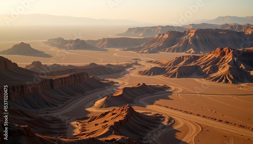 drought stricken plateau with dusty ridges and rocky outcrops, intense light casting hard shadows — gives feeling of arid vastness and heat