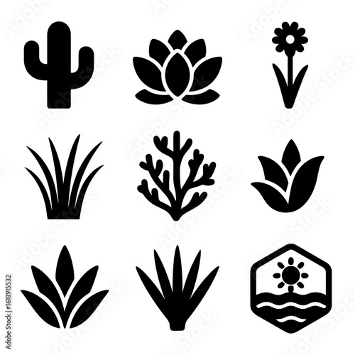 Drought-Resistant Plant Icons. Solid, filled icons set of native and drought-resistant plants: cactus icon,