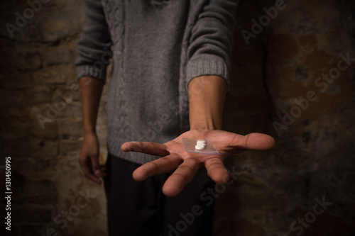 Drug addict man showing wheels. Closeup picture of man's hand with drugs on it. Man posing on street and showing drugs to camera.