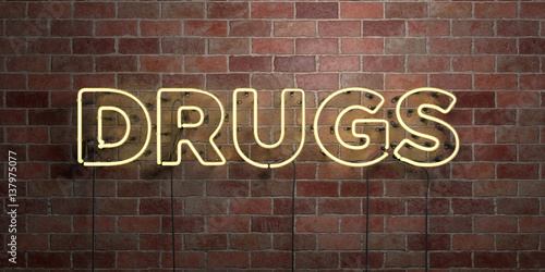 DRUGS - fluorescent Neon tube Sign on brickwork - Front view - 3D rendered royalty free stock picture. Can be used for online banner ads and direct mailers..