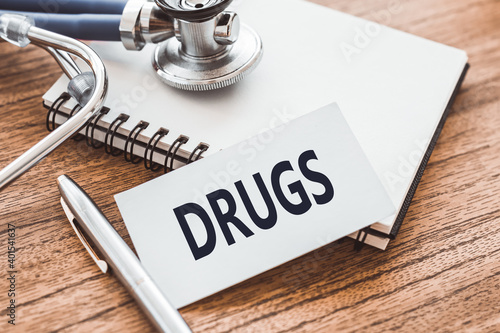 DRUGS text on card on wooden table with stethoscope and notepad for medical records.