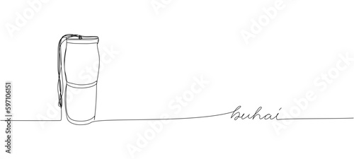 Drum, Buhai one line art. Continuous line drawing of Ukrainian folk percussion instrument, drum, drumstick, kit, stick, music, band, percussion, sound, with an inscription, lettering, handwritten.