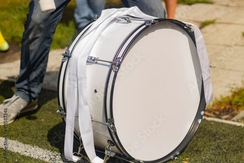 Drum on football. Football fan beats drumsticks into membrane. Details of attributes of football fans.