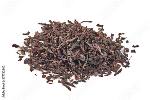 Dry black tea leaves, isolated on white background.