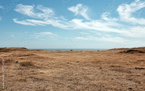 Dry, brown field meets a calm ocean under a bright blue sky with wispy clouds. Peaceful, expansive landscape