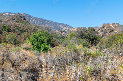 Dry brush and tall trees in late summer southwest sun on bright morning