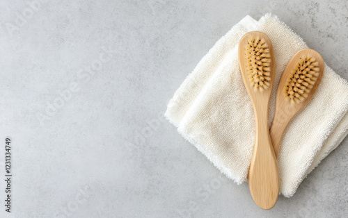 dry brushing set with wooden handles on white towel, perfect for skincare routines and relaxation. Enhance your self care with these eco friendly brushes