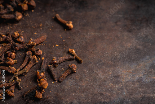 Dry cloves spices on the dark rustic background. Selective focus. shallow depth of field.