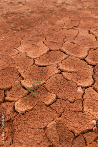Dry cracked earth background with the green grass-awaited growth because the world warms up every year.
